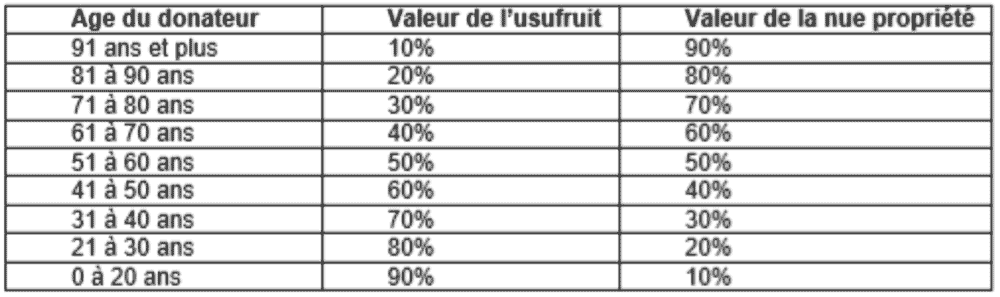 Dans le cas d’une donation en nue-propriété avec réserve d’usufruit, la part de chacun est établie en fonction de l’âge du donateur selon le barème suivant.