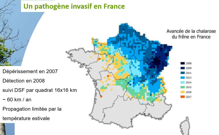 Phytophthora Ramorum est un agent phytopathogènepolyphage qui attaque de nombreuses espèces ligneuses forestières et ornementales (environ 120 espèces). Il se transmet principalement par le vent et de proche en proche par le biais de gouttes d’eau infectées.